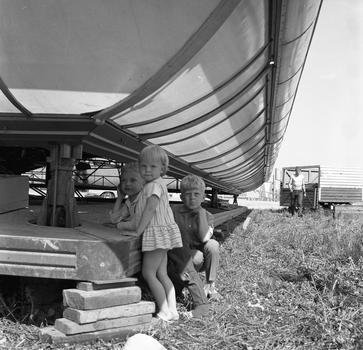 Barnens Dag. Tre barn står under något som kan vara en åkattraktion. Den står inte på någon festplats. En man, med bar överkropp, kommer gående mot dem.