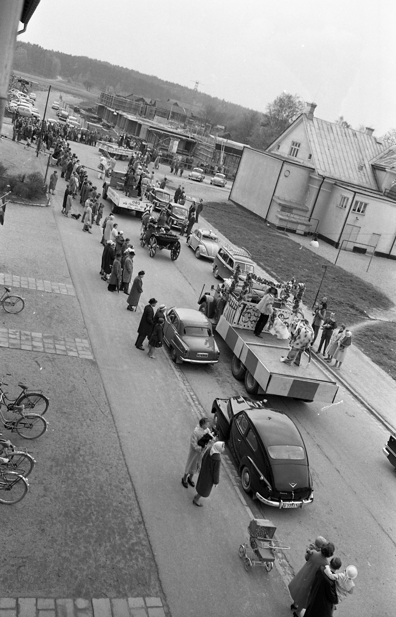 Barnens Dag firas med en parad genom staden. Flera lastbilar, med utklädda människor på flaken, samt en häst med vagn deltar. Bilar är parkerade längs Österled och människor står på trottoaren och ser på.
