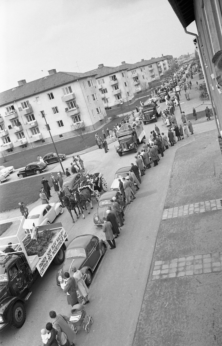Barnens Dag firas med en lång parad genom staden. Det är många lastbilar som ingår i kortegen men även ett ekipage med två hästar. Bilar står parkerade längs Österled och människor står på trottoaren och ser på.
