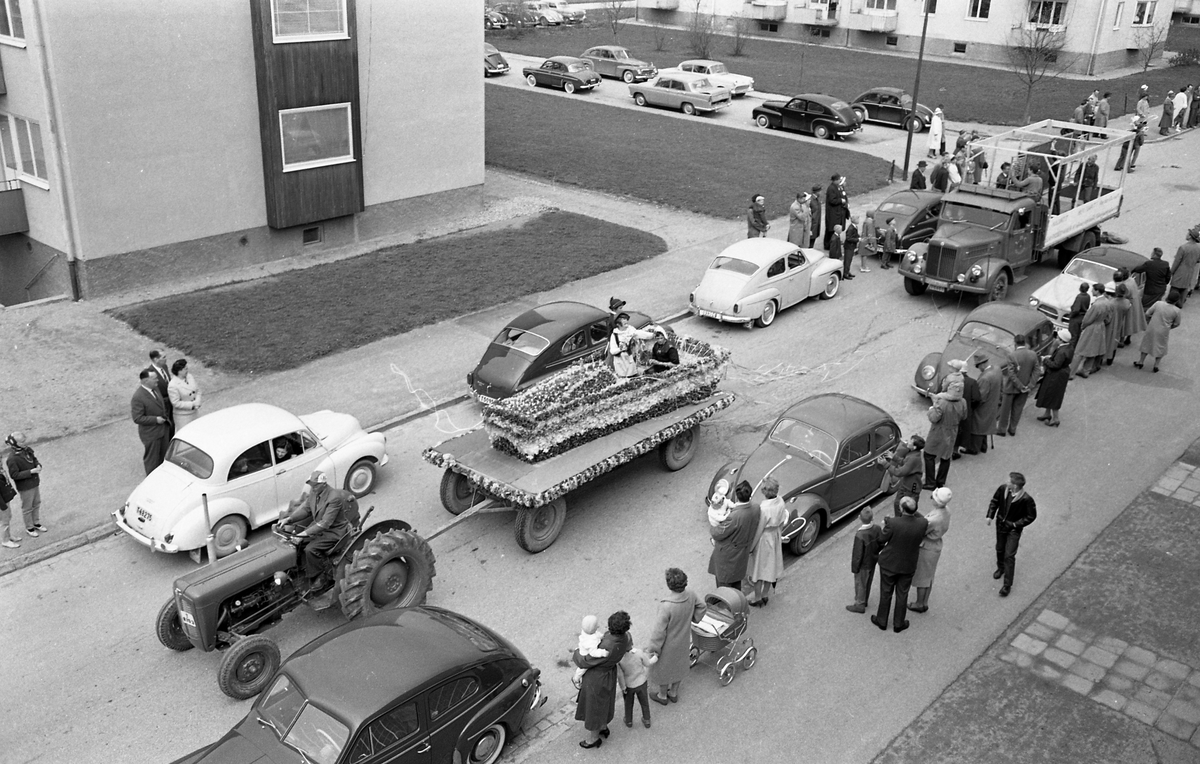 Barnens Dag firas med en kortege genom staden. Närmast i bilen är en traktor med vagn, dekorerad med blommor. Bilar står parkerade längs Österled och publiken står på trottoaren.