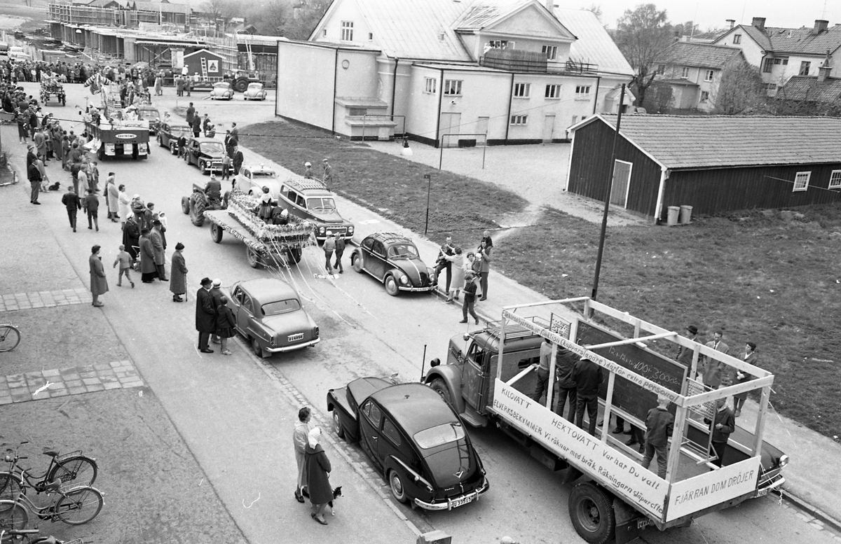 Barnens Dag firas med en kortege genom staden. Här kör lastbilar, med dekorerade flak, på Österled. Bilar är parkerade längs vägen och människor står på trottoaren och ser på. Ett bygge pågår i bakgrunden.