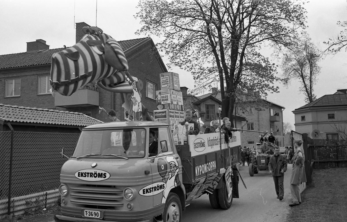Barnens Dag firas med en kortege genom staden. Närmast i bild en lastbil som gör reklam för Ekströms soppor. Människor står efter vägen och ser på.