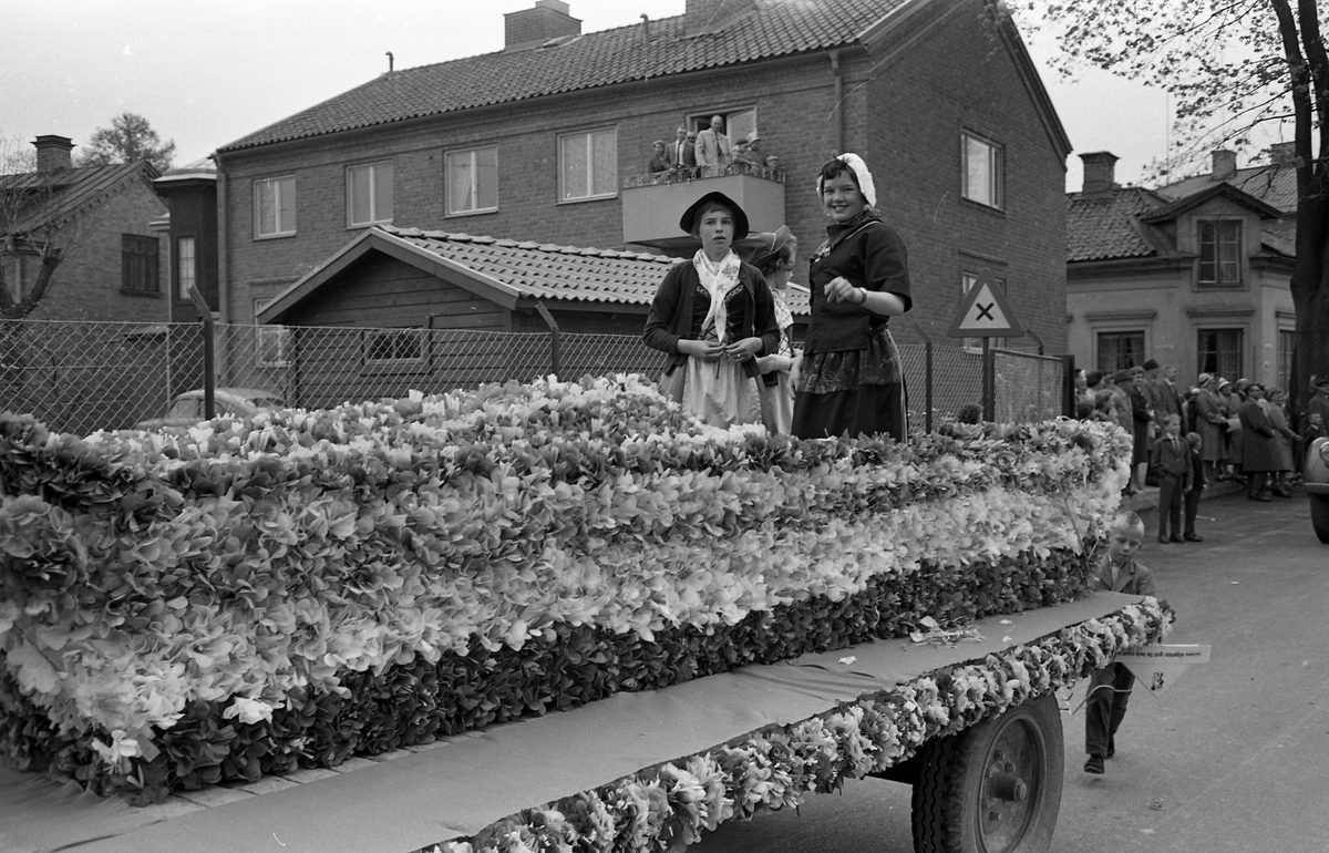 Barnens Dag firas med en kortege genom staden. Här är en blomsterprydd vagn med tre flickor på. Publiken står efter vägen och ser på.