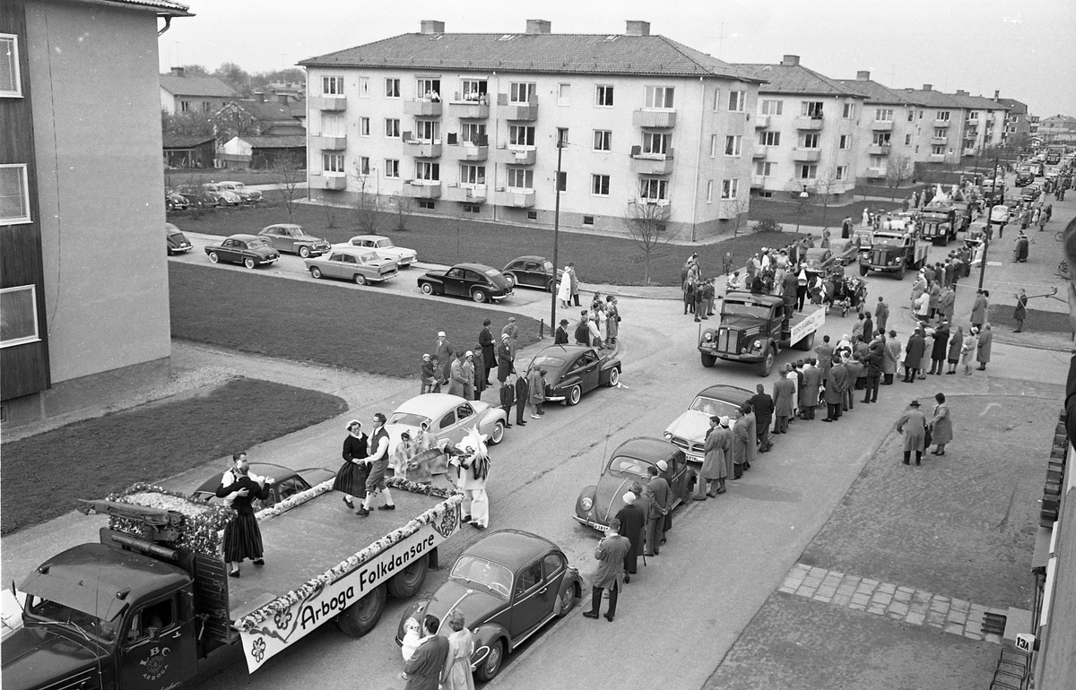 Barnens Dag firas med en lång kortege genom staden. Platsen kan vara Långa Raden på Österled. Främst ses Arboga Folkdansare. Mannen längst bak på flaket är Henry Söneby.