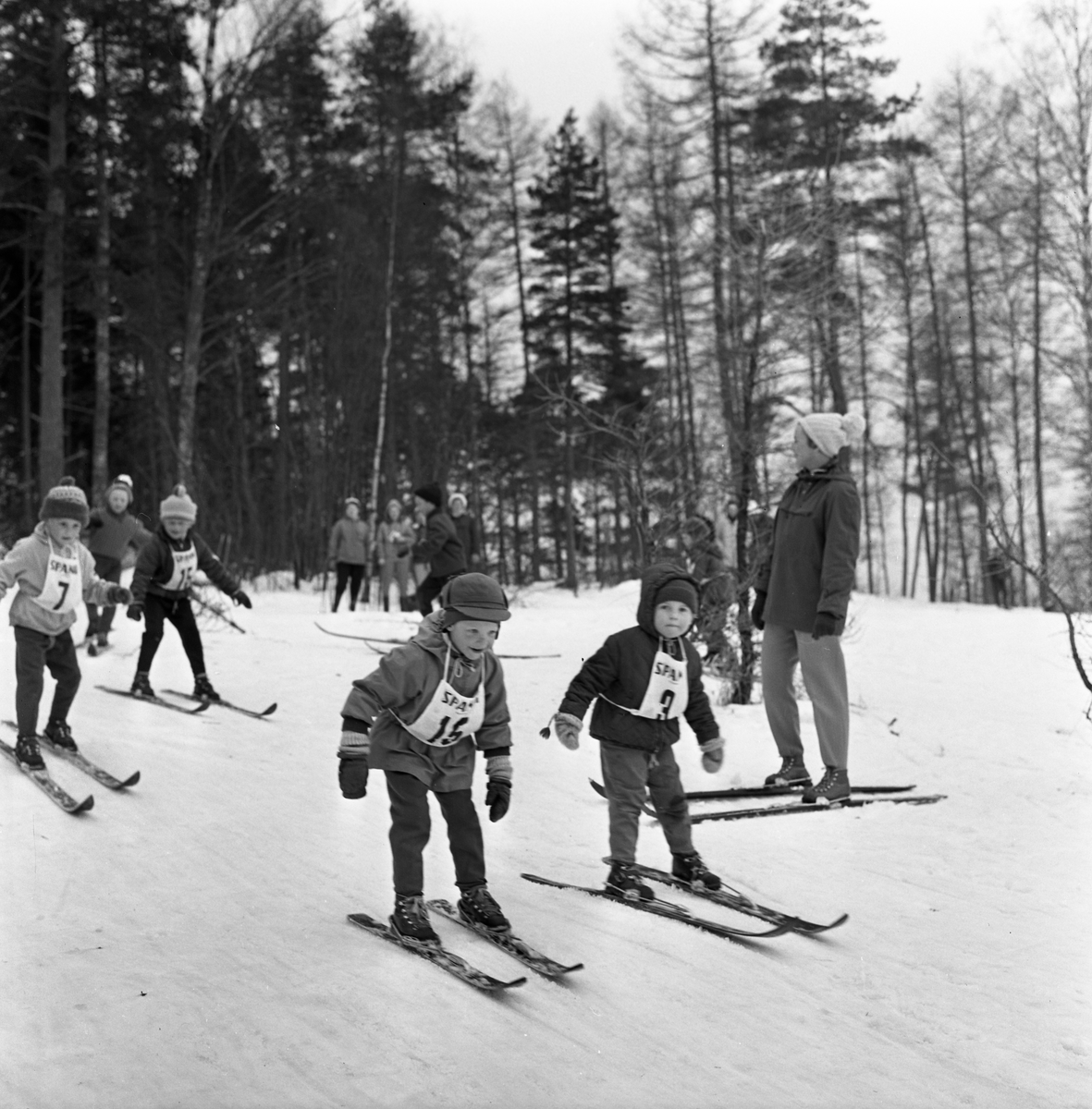 Barn, försedda med nummerlappar, åker skidor nerför en backe. De har inga stavar. Några tittar på. En skog ses i bakgrunden.
