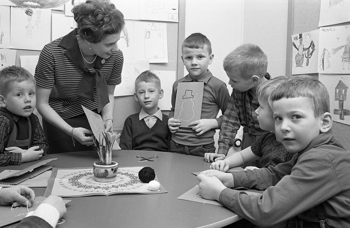 Barnträdgård hos Arbetarnas Bildningsförbund, ABF, på Stadsgården. En "Fröken" och sex barn är samlade vid ett bord. De har sytt med garn. På väggen, bakom dem, är teckningar uppsatta.