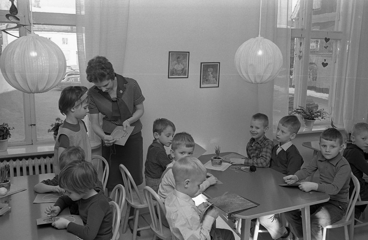 Barnträdgård, Arbetarnas Bildningsförbund, ABF, på Stadsgården. Barnen sitter vid borden och syr snögubbar av garn på pappskivor. "Fröken" hjälper till. Genom fönstret syns Stora torget.
