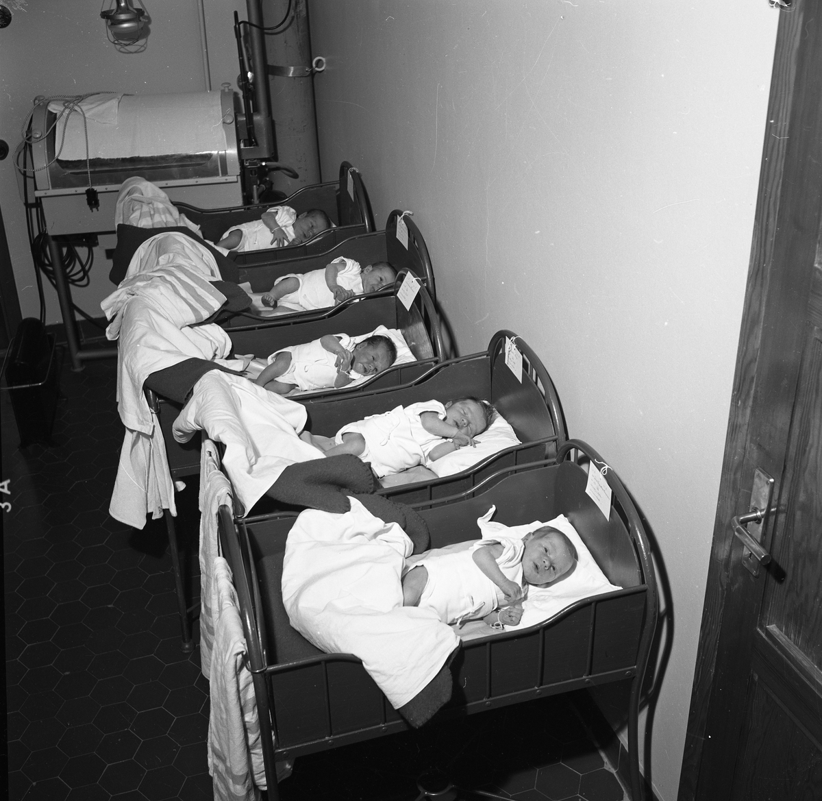 Fem nyfödda bäbisar i var sin säng. De är sista "kullen" som föddes på BB vid Kungsörsvägen.