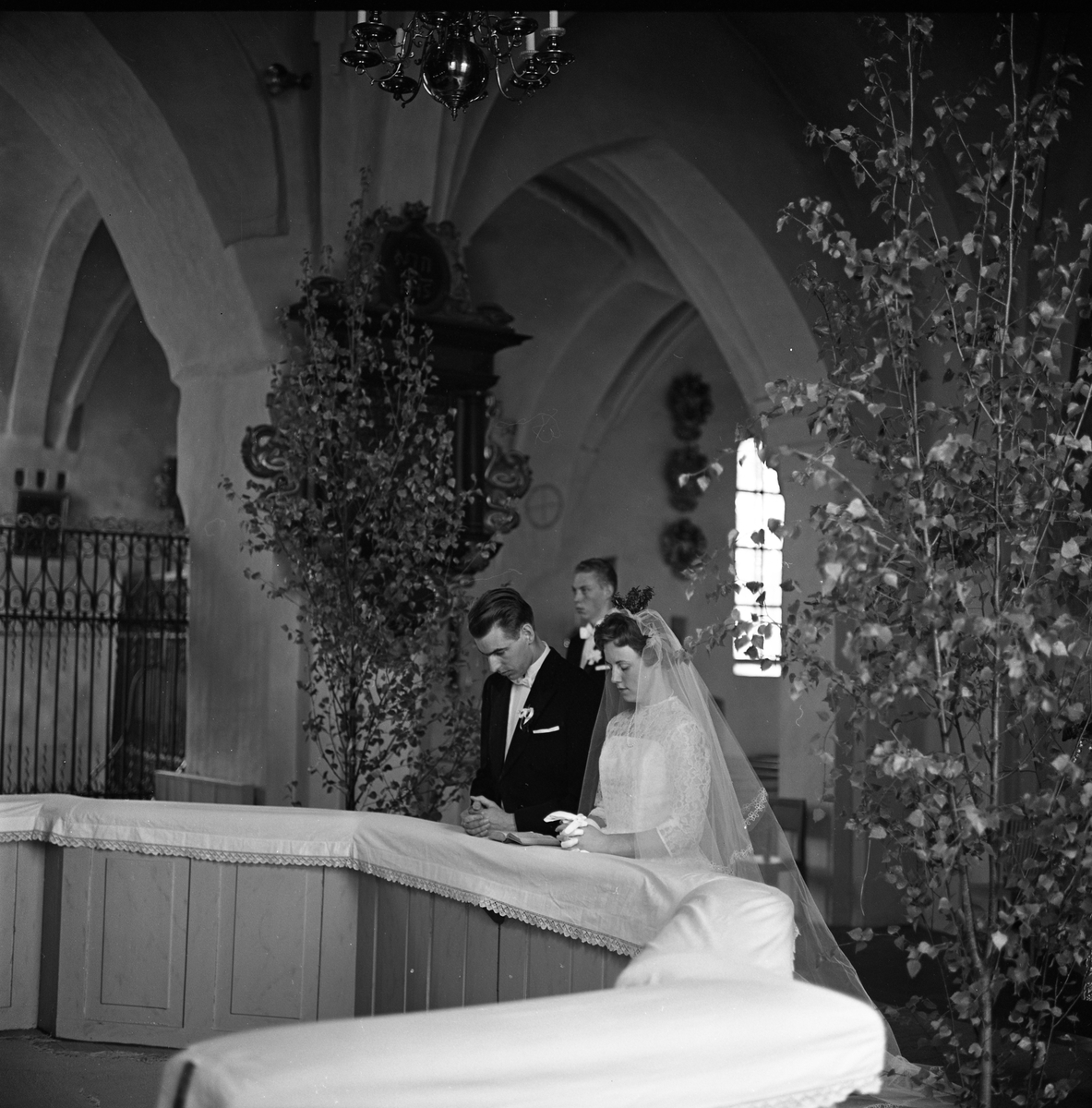 Vigsel i Säterbo kyrka. Brudparet herr Olsson och fröken Tallqvist knäböjer vid altarringen. Kyrkan är dekorerad med björkar.