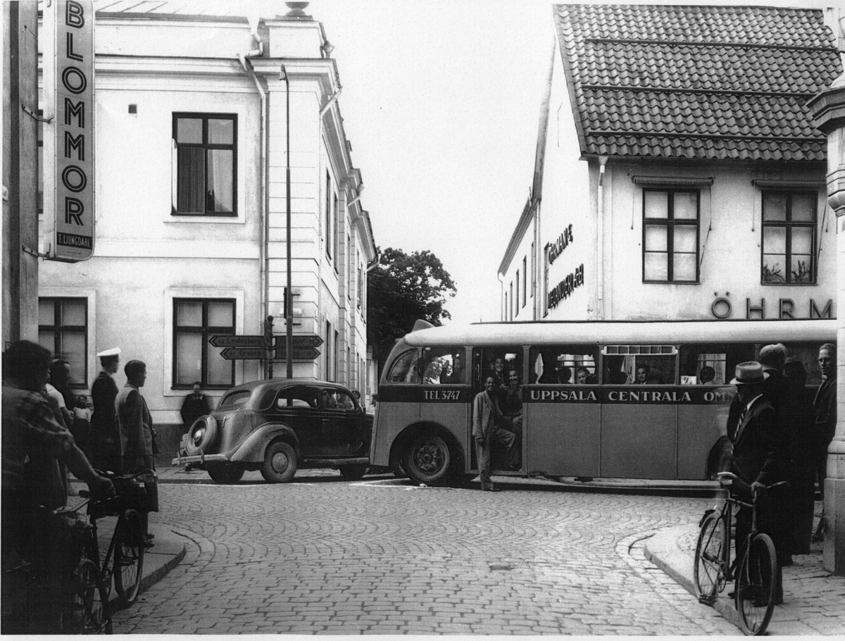 En buss, från Uppsala, stannar utanför Öhrman & Melander på Nygatan. En färgad man kliver av.