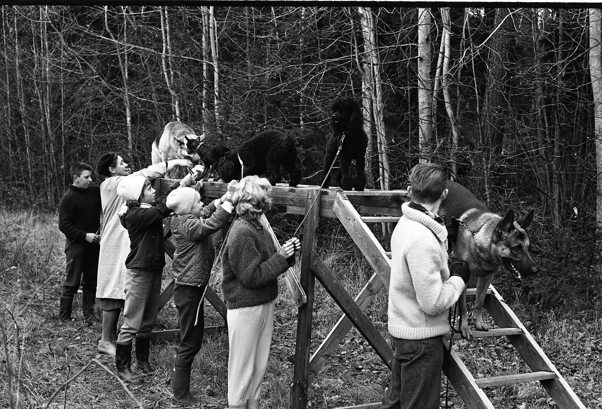 Arboga Brukshundklubb. Hussar och mattar tränar sina hundar att klättra i trappa. Två schäfrar, två pudlar och en liten pincher övar.