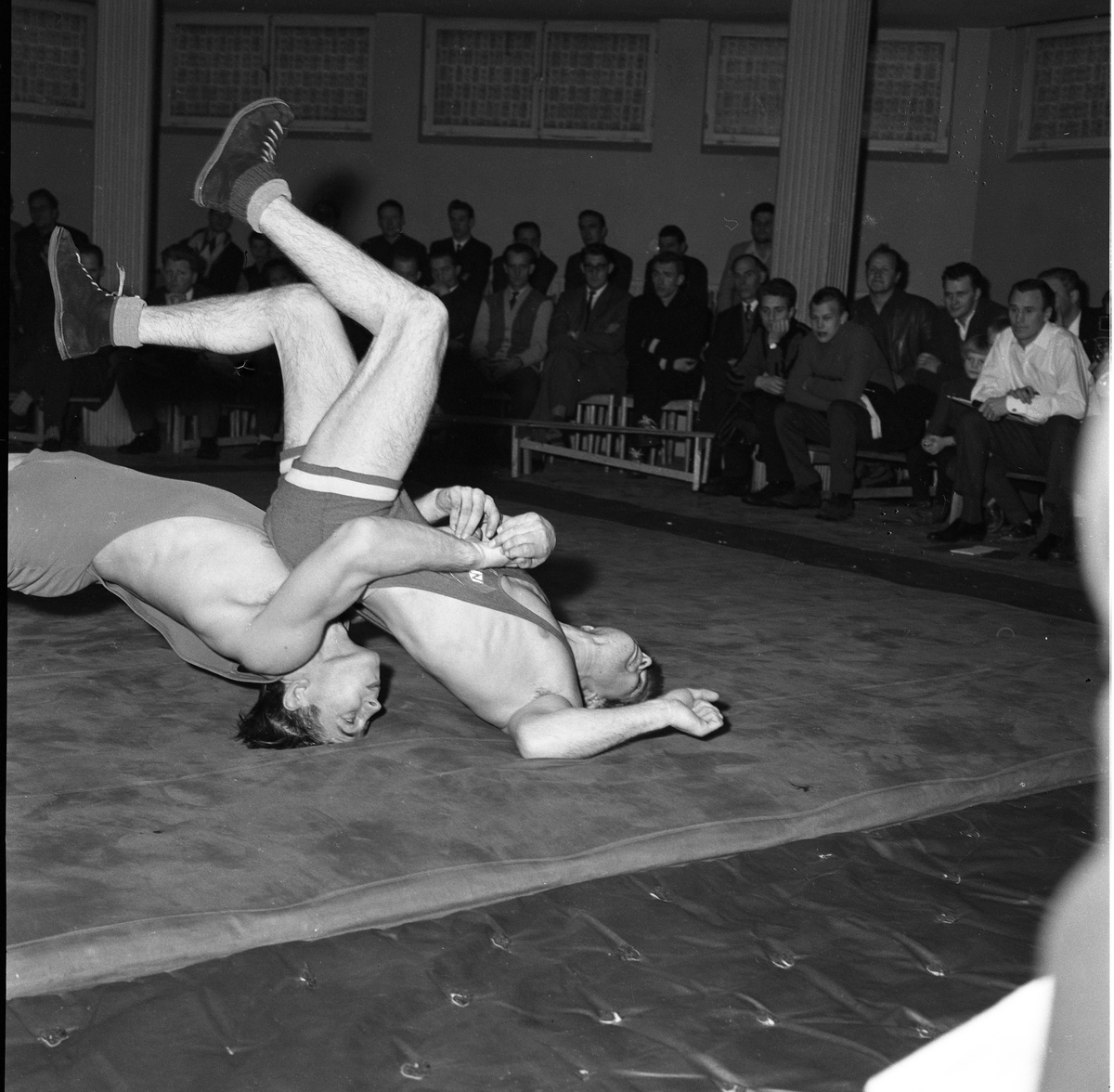 Brottning. Arboga AK tävlar mot Sala. Två brottare på mattan. Publiken på bänkar efter väggen.