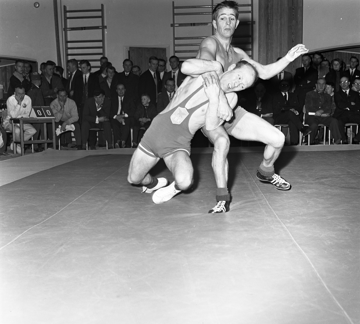 Två män på brottarmattan. Publik i gymnastiksalen.