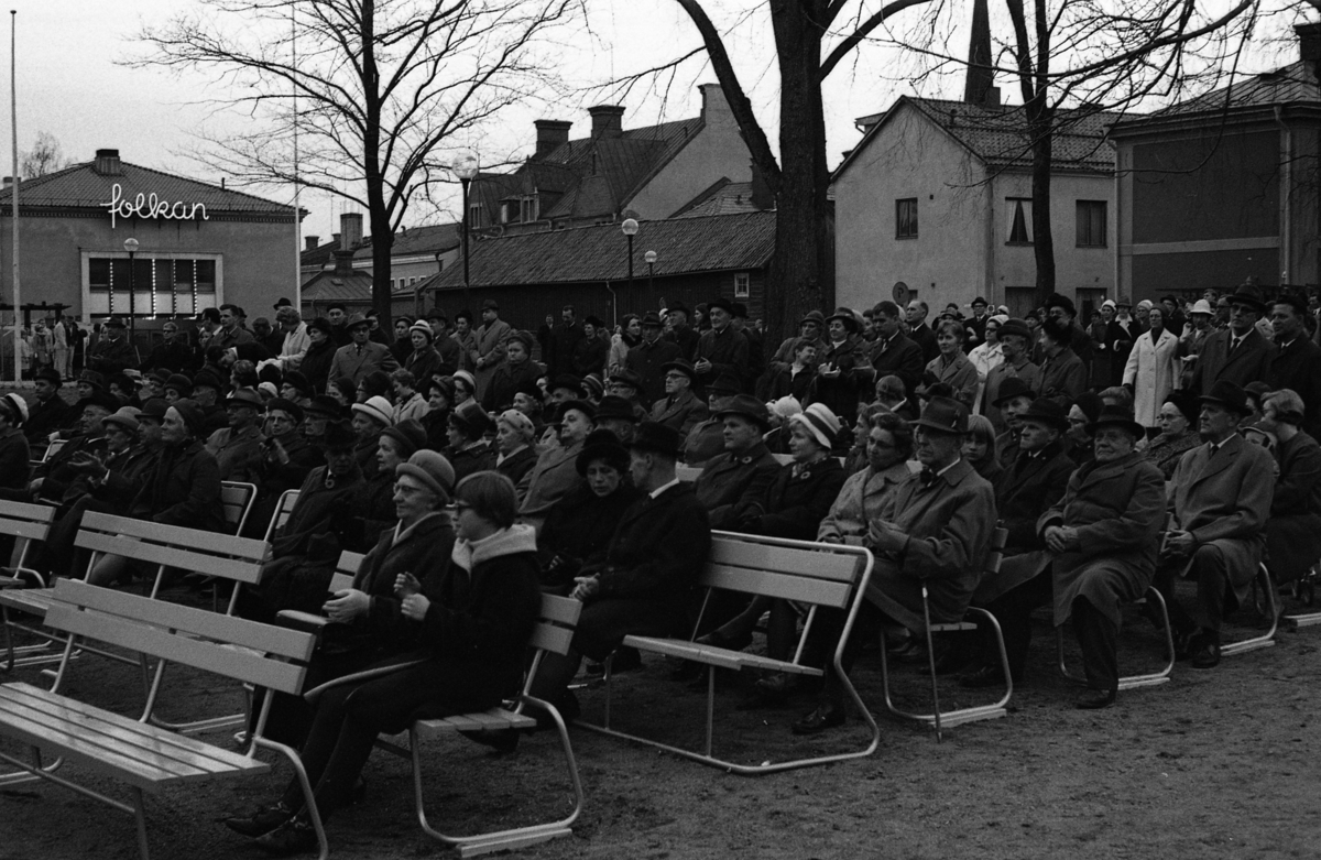 Vårens ankomst firas i Olof Ahllöfs park. En stor publik är samlad. De sitter på bänkar eller står runt området. Till vänster ses Folkan, Medborgarhuset, och husen på Ahllöfsgatan.