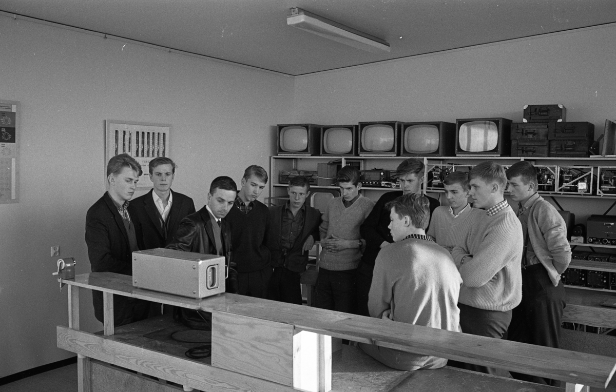 Läraren Åke West tillsammans med en grupp elever. Han visar en teknisk apparat. Till höger om Åke står Lars-Olov Antonsson och Ulf Sörén. Längst till höger i bild, Anders Eriksson.
