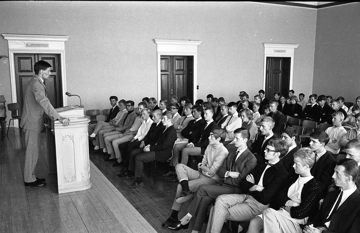 Avslutning för eleverna på yrkesskolan. Rektor Åke Bergström håller tal.