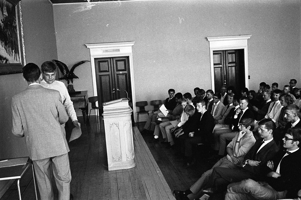 Avslutning för eleverna på yrkesskolan. Rektor Åke Bergström delar ut betyg till Hans Larsson.