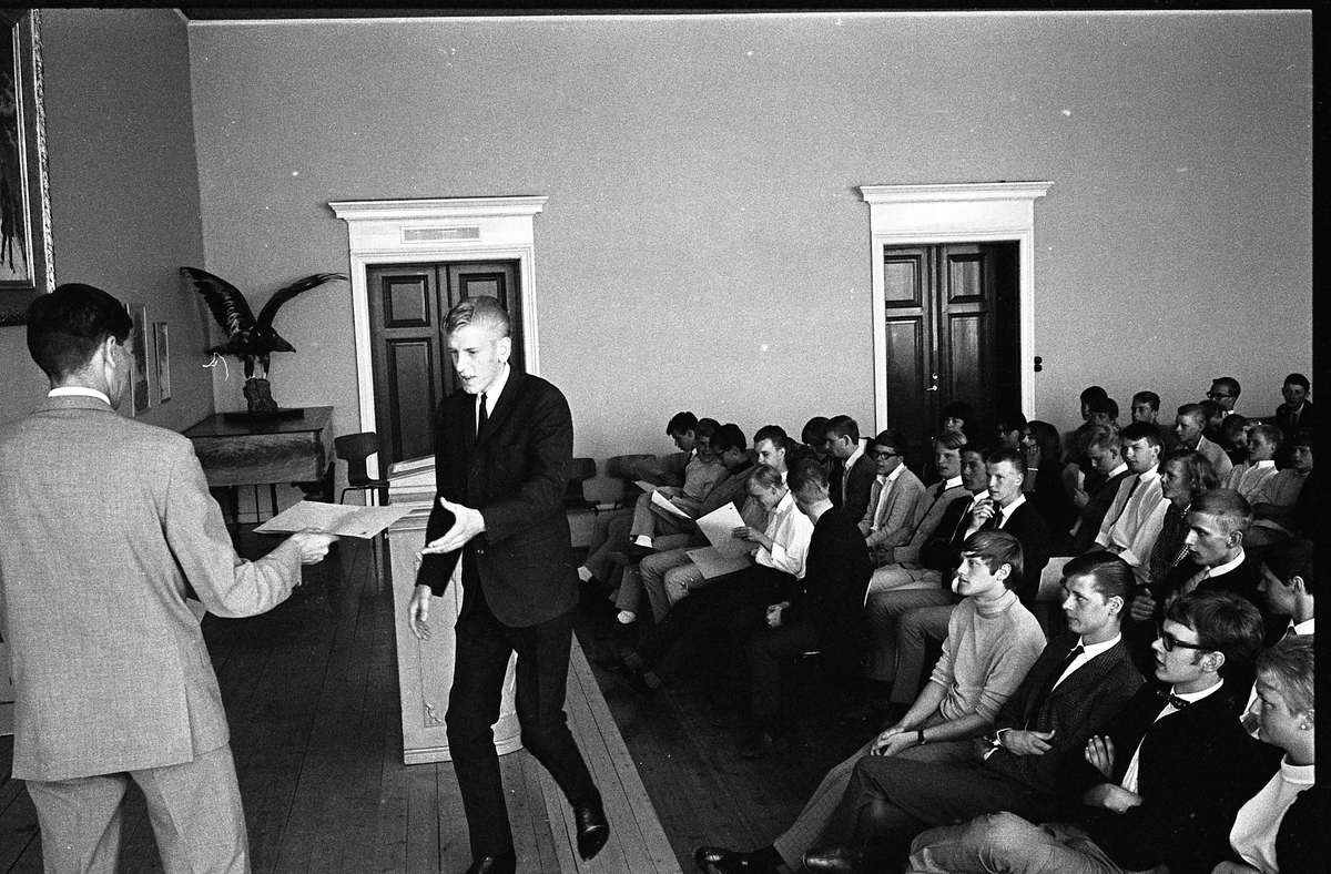 Avslutning för eleverna på yrkesskolan. Rektor Åke Bergström delar ut betyg till Rolf Rickard.