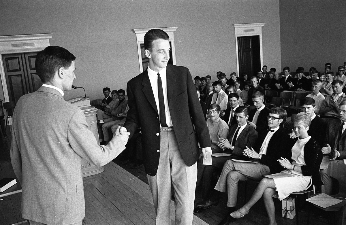 Titel: Avslutning för eleverna på yrkesskolan. Rektor Åke Bergström delar ut betyg till var och en. Platsen är aulan, Nikolaiskolan.