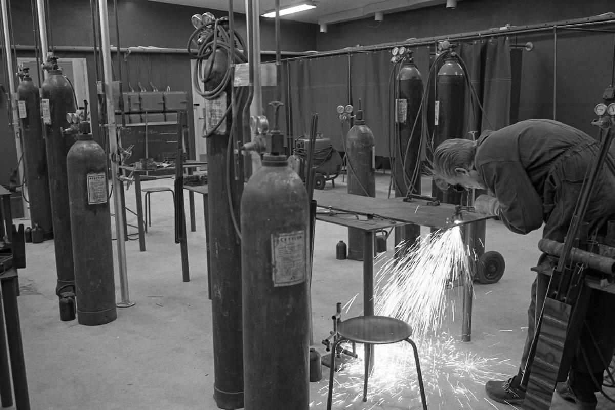 Yrkesskolan. En elev svetsar. Han har skyddsglasögon, handskar och skyddsrock på sig.