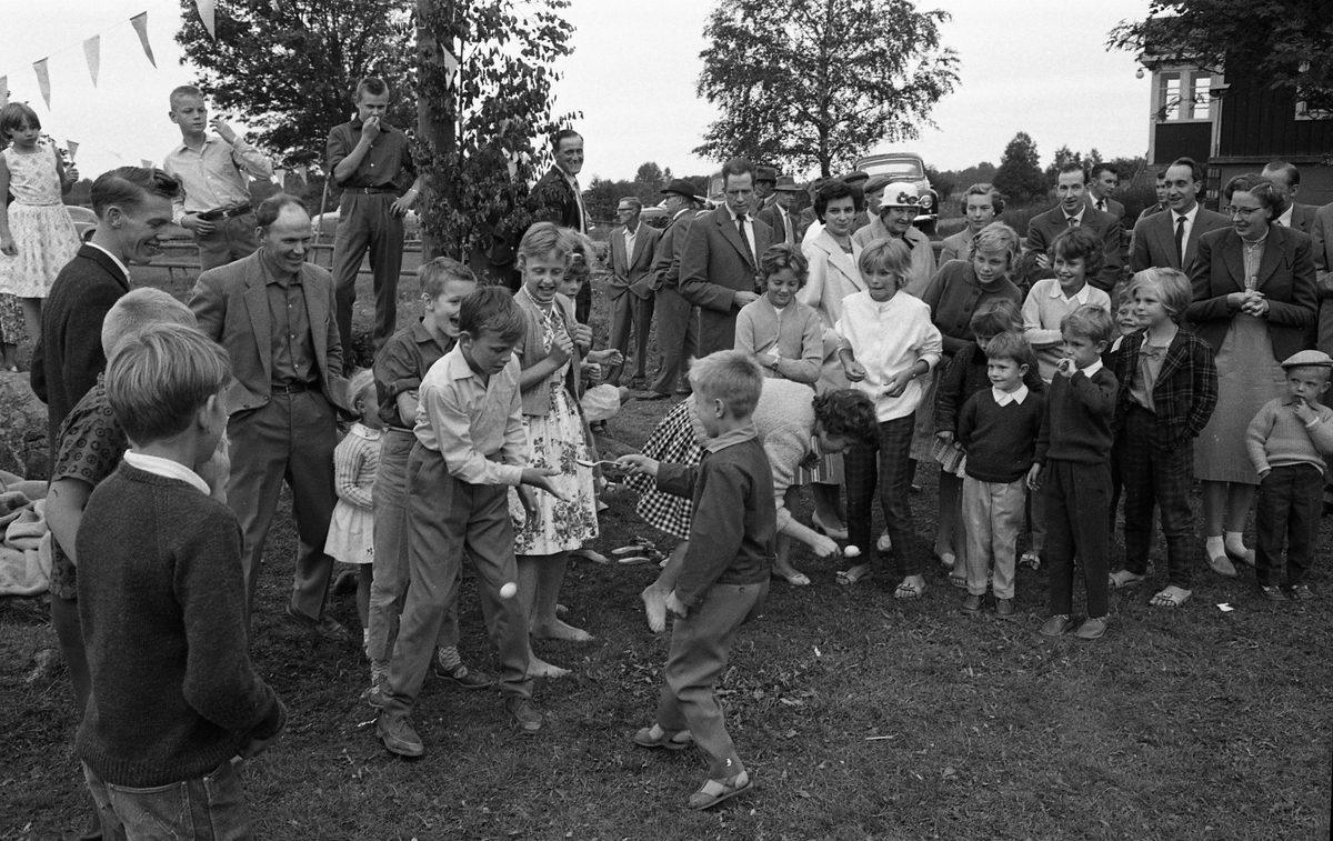Festligheter i Algots hage i Tyringe. Här är det ägglöpning på gång. Stafettöverlämningen går inte så bra för Klas-Håkan Gustavsson (Findla) och Nils Arvidsson (Tyringe). Flickan som syns mellan pojkarna kommer från Sjölunda.