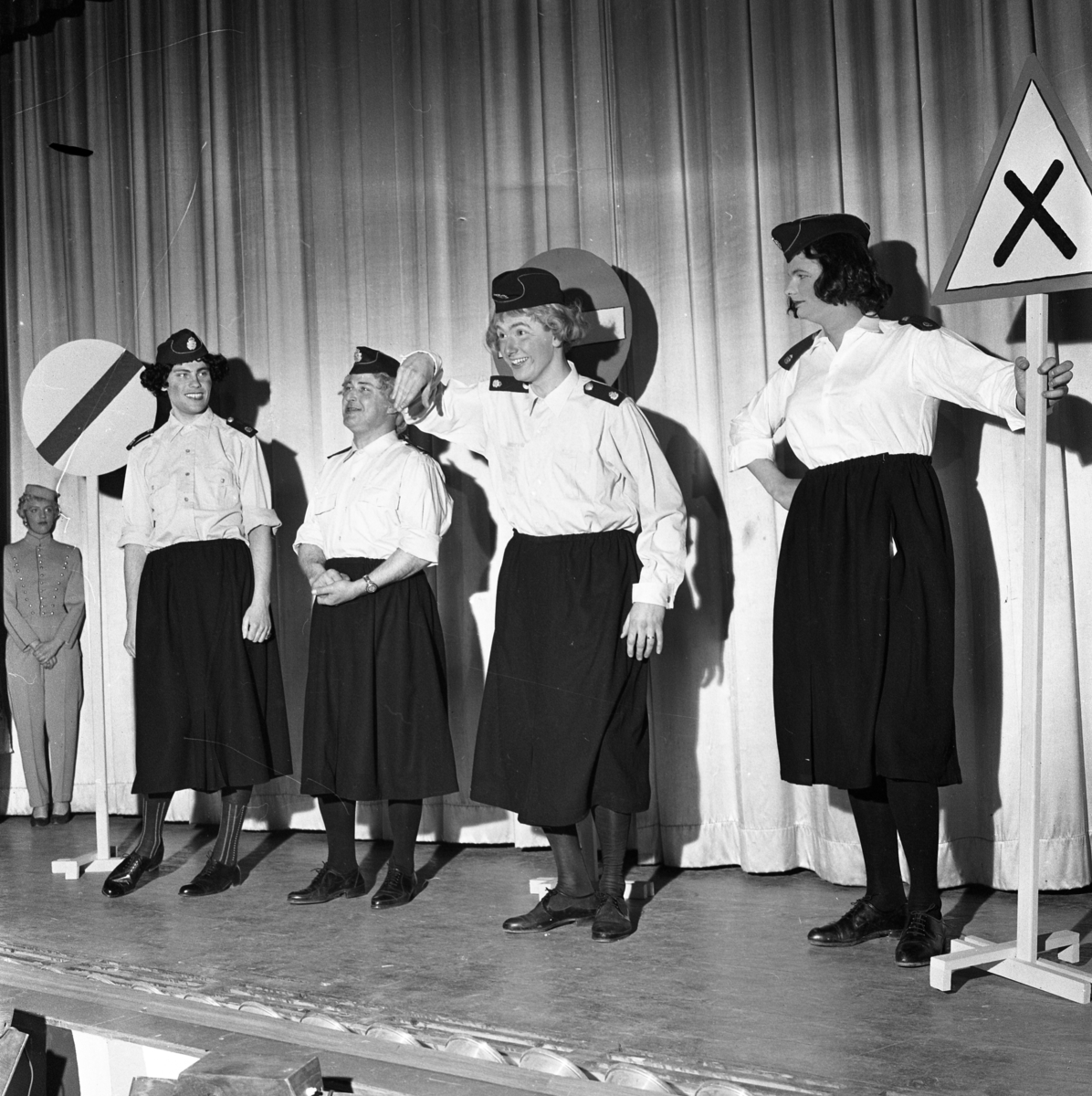 En kvinna klädd som piccolo och fyra män utklädda till kvinnor.