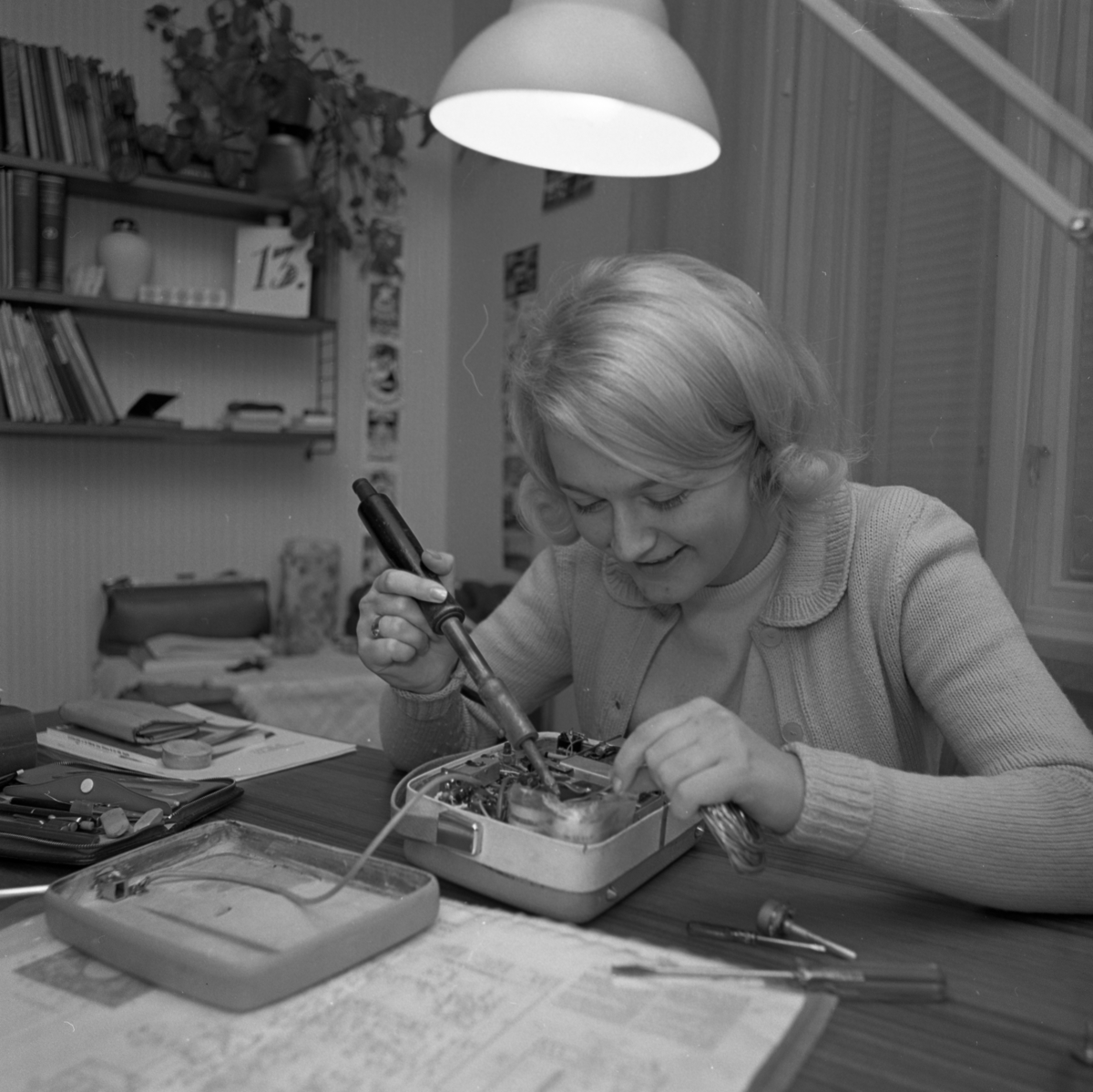 Ung kvinna som sitter vid skrivbordet. Framför henne ligger en isärtagen teknisk apparat. Hon håller en skruvmejsel i ena handen. Fler mejslar liggar på skrivbordet. En skrivbordslampa syns. På väggen hänger en bokhylla, modell String, med böcker, prydnadssaker och en krukväxt.