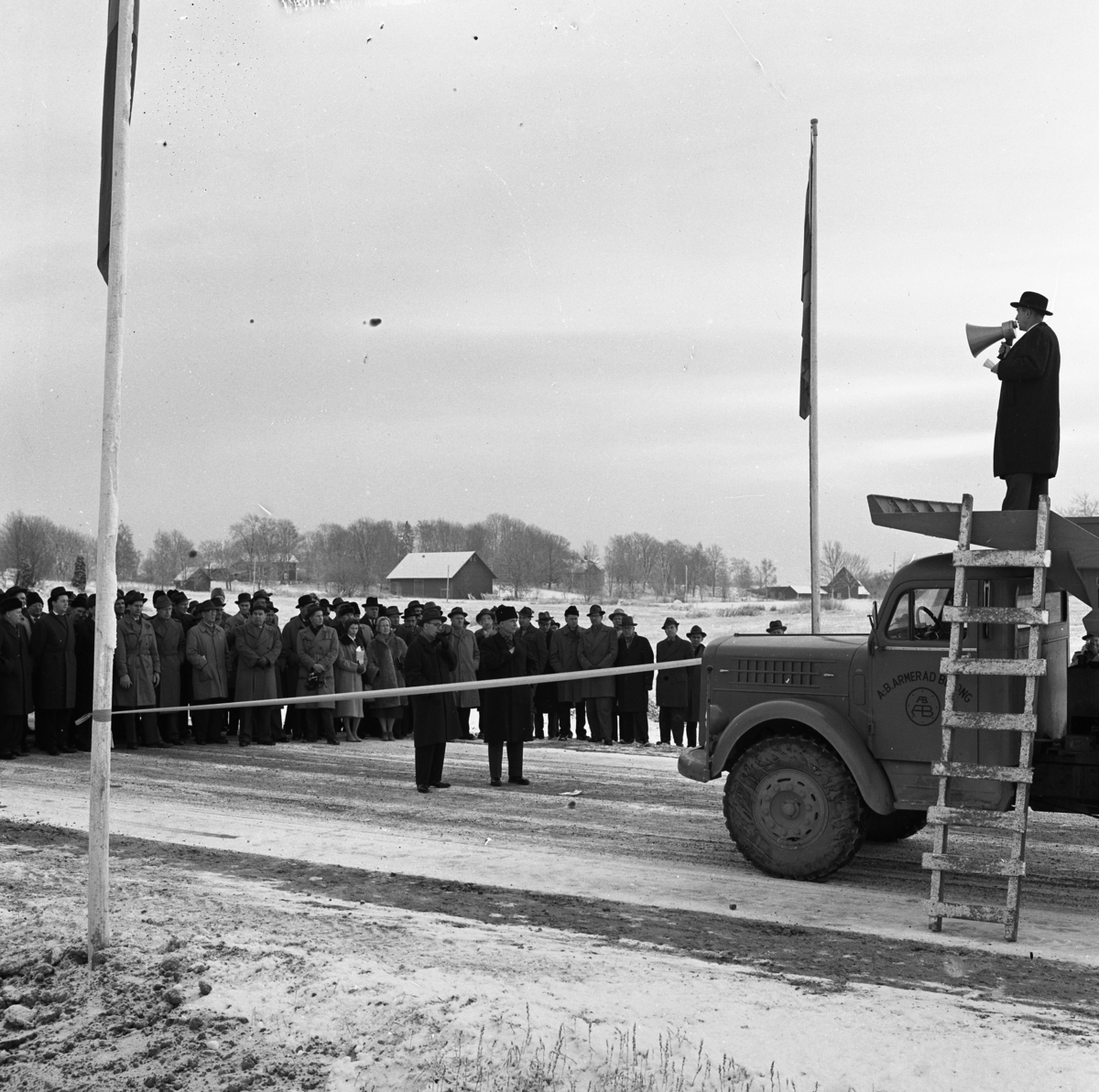 Örebrovägen ska öppnas efter ombyggnad. En stor publik vinterklädda människor har samlats vid bandet som snart ska klippas. På taket till en lastbil står en man och håller tal i en megafon. En stege är lutad mot lastbilshytten. På dörren står det "AB Armerad Betong". En gård ses i bakgrunden.