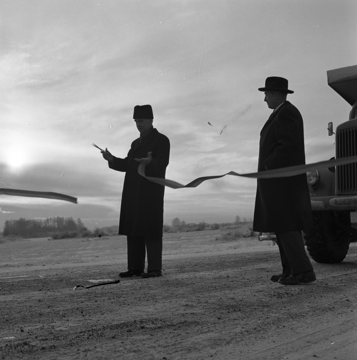 Bandet klipps! Örebrovägen öppnas efter ombyggnad. En man med vinterrock och krimmelmössa håller i saxen. Bredvid honom står en man i vinterrock och hatt. Bakom honom syns motorhuven på en lastbil.