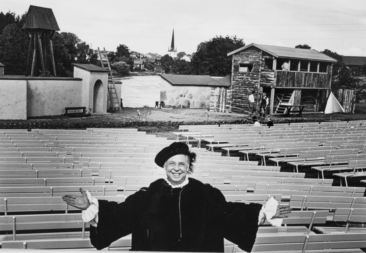 Rune Lindström framför den uppbyggda utomhusteatern intill Arbogaån. Rune är klädd i medeltidskläder. I bakgrunden skymtar tornet på Heliga Trefaldighetskyrkan.