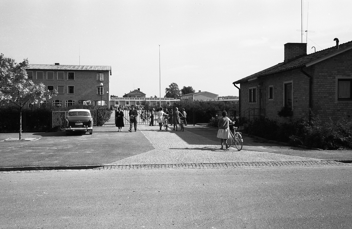 Infarten till Gäddgårdsskolan. Människor i rörelse. En bil står parkerad.