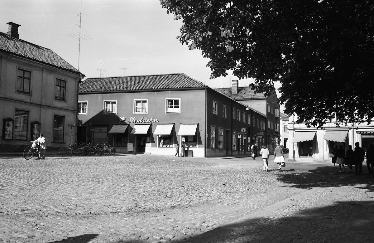 Järntorget. Stenbäckers affär på Smedjegatan, Hemslöjd och leksaker på Järntorgsgatan. Människor i rörelse.