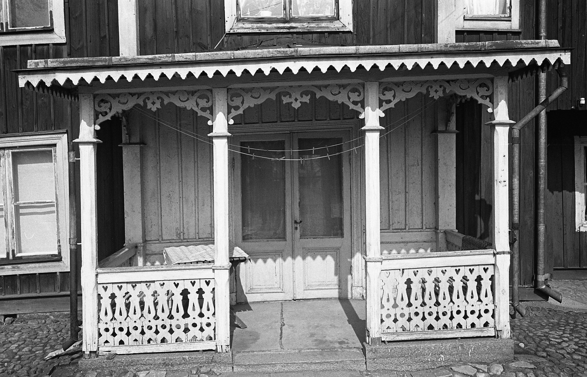 Exteriör, entré till bostadshus i trä. Tak över ytterdörren. Snickarglädje.