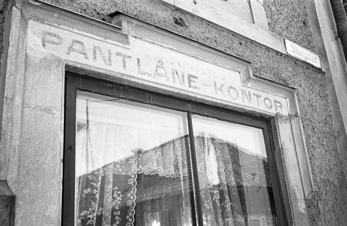 Skylt över fönstret. Det står möjligen "CG Gustafsson" ovanför texten PANTLÅNE-KONTOR. Gatuskylten bredvid visar att kontoret ligger på Storgatan.