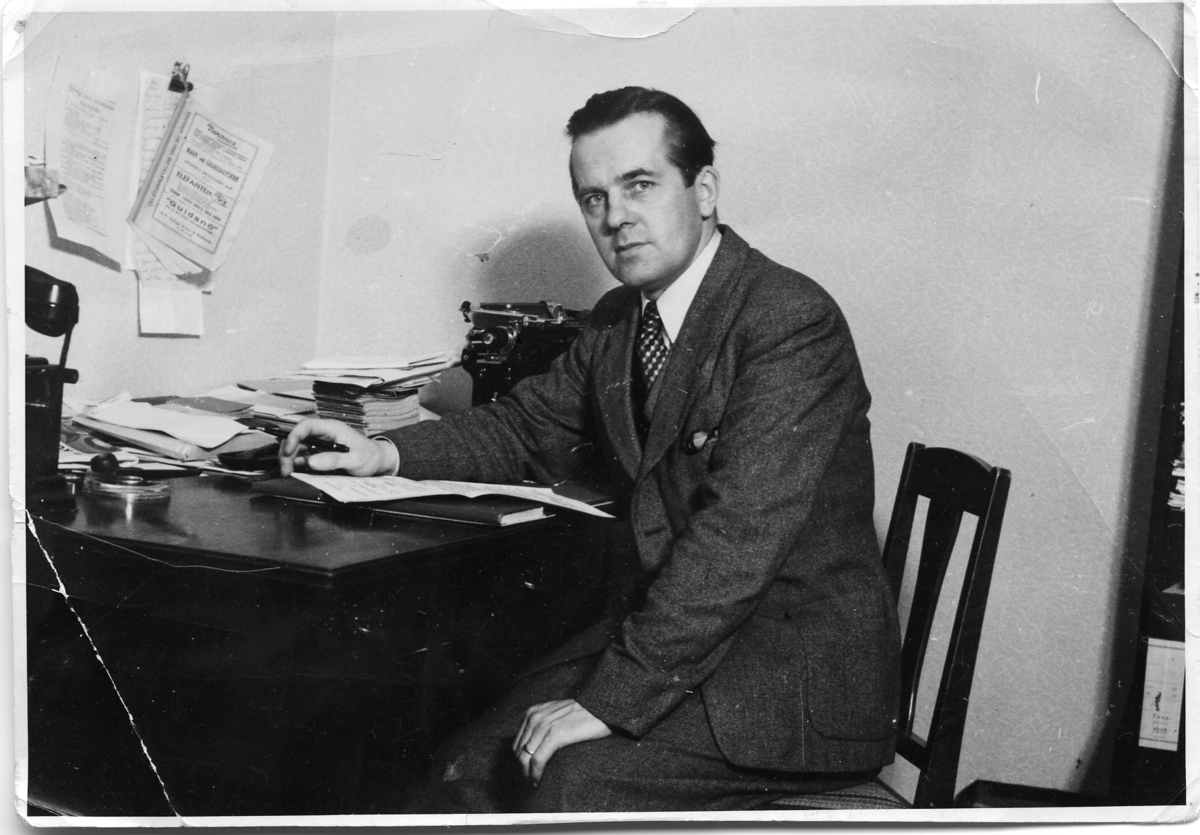Kostymklädd man som sitter vid skrivbordet. Han har en penna i handen. På skrivbordet skymtar en telefon och en skrivmaskin.