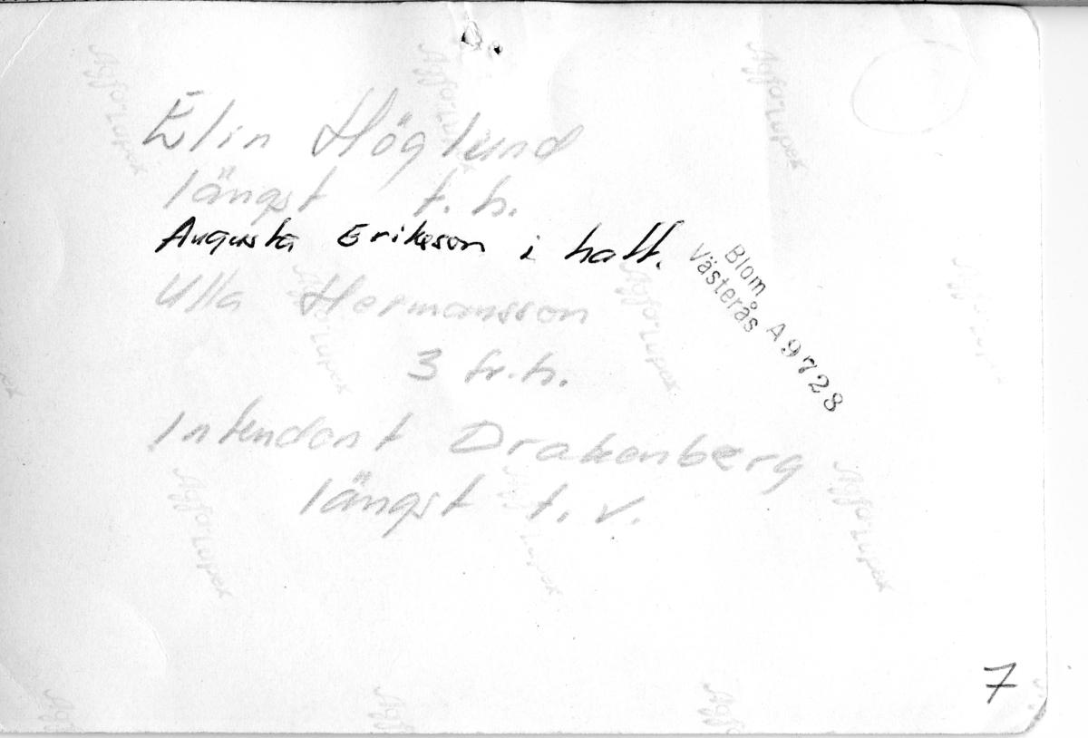 Baksidan på foto föreställande picknick i samband med Arbogautställningen 1935. Handskriven text om vilka personer som är med i gröngräset. Elin Höglund sitter längst till höger.