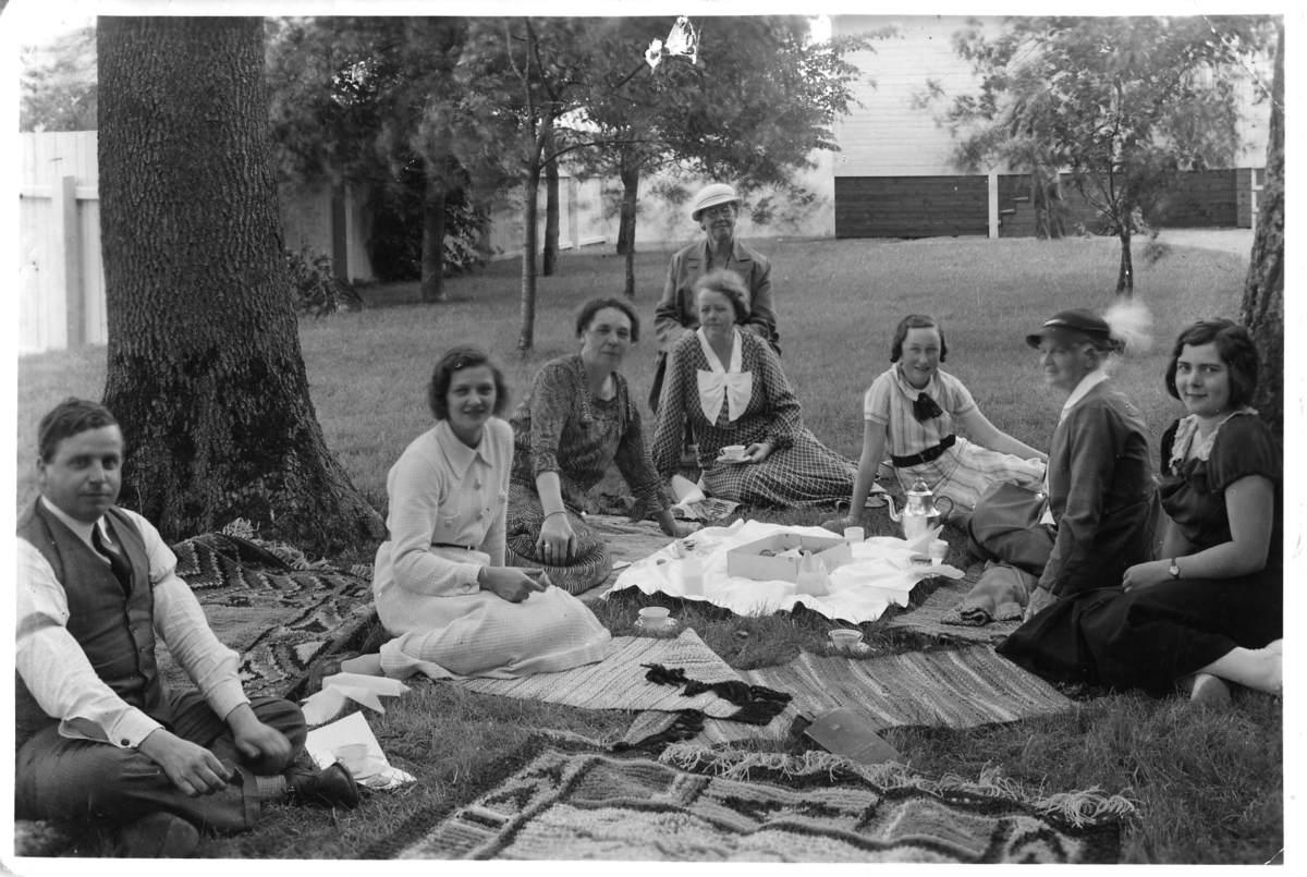 Picknick under Arbogautställningen 1935. Sju kvinnor och en man sitter på mattor utlagda i gräset. Avkoppling i Ahllöfsparken/Olof Ahllöfs park nära Arbogautställningen. De har kafferast i förberedelsearbetet inför utställningen.