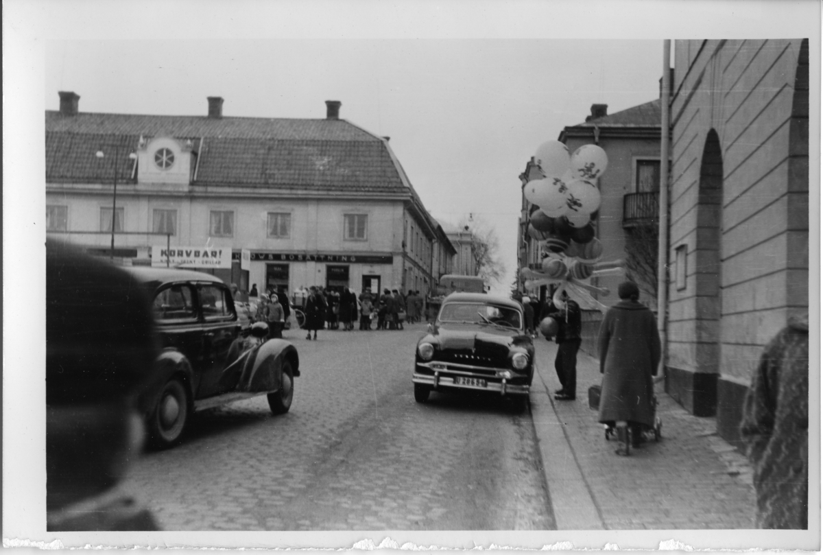 Stora torget med bilar och en ballongförsäljare. Bosättningsaffär i bakgrunden. Rådhuset till höger.