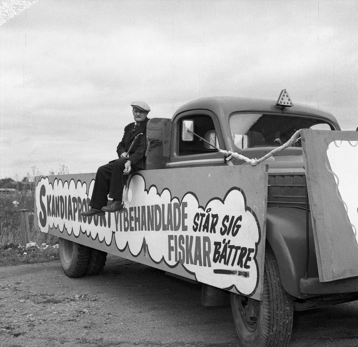 Barnens Dags 30-årsjubileum. Severin Holm, kallad Seffran, Arbogas meste metare, sitter på ett lastbilsflak.