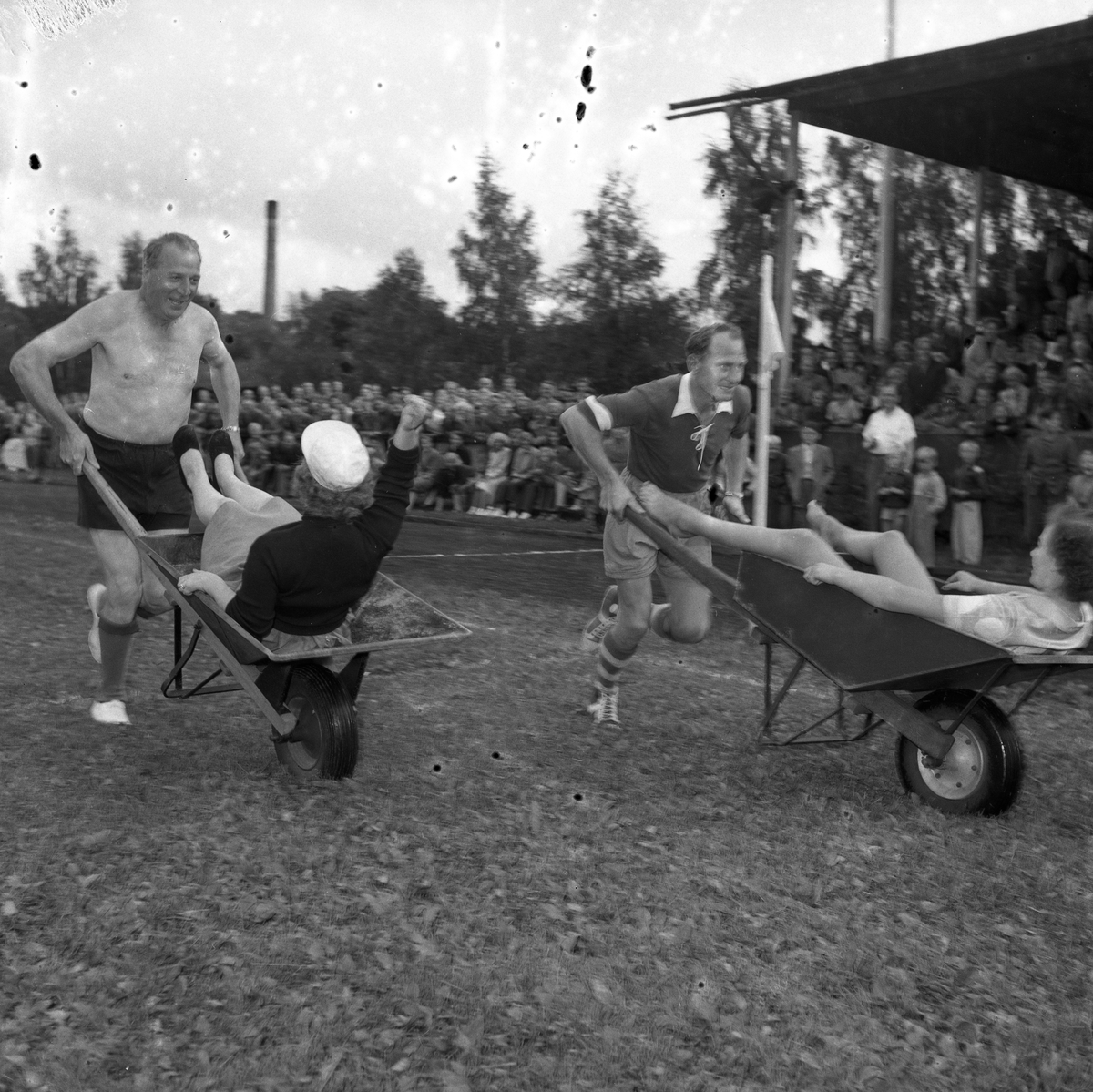Till vänster springer den lokala underhållaren Gothard Holmberg (kallad Gotte). Han är fabrikör på Arboga Ångsåg AB. Men just nu skjutsar han en revyflicka i skottkärran. Han tävlar mot en kändis från Casinorevyn.