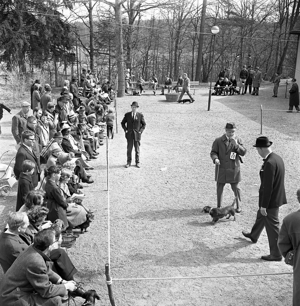 Hundutställning. En man med nummerlapp på rocken, visar upp en tax för domarna. Utställning pågår i två ringar samtidigt.