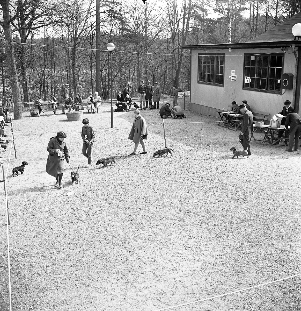 Hundutställning utomhus. Fyra personer visar sina strävhåriga taxar i utställningsringen. Publiken sitter på bänkar och ser på.