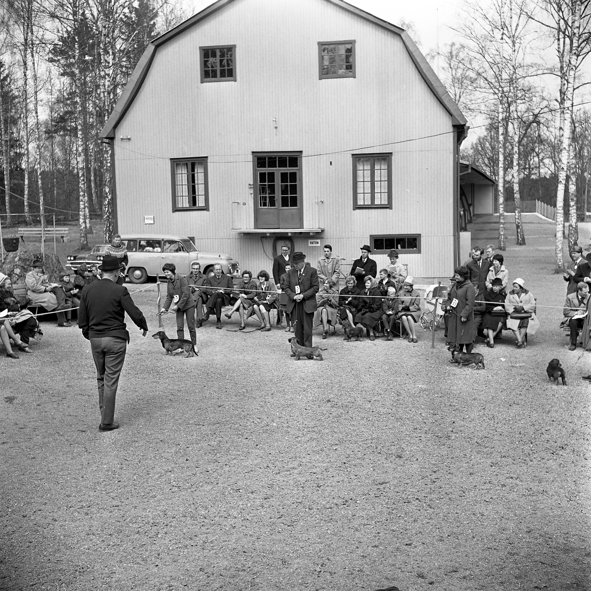 Hundutställning utomhus. Hussar och mattar med nummerlappar visar upp sina strävhåriga taxar för domaren. Publiken sitter på bänkar och ser på. Bakom dem står en stor byggnad.