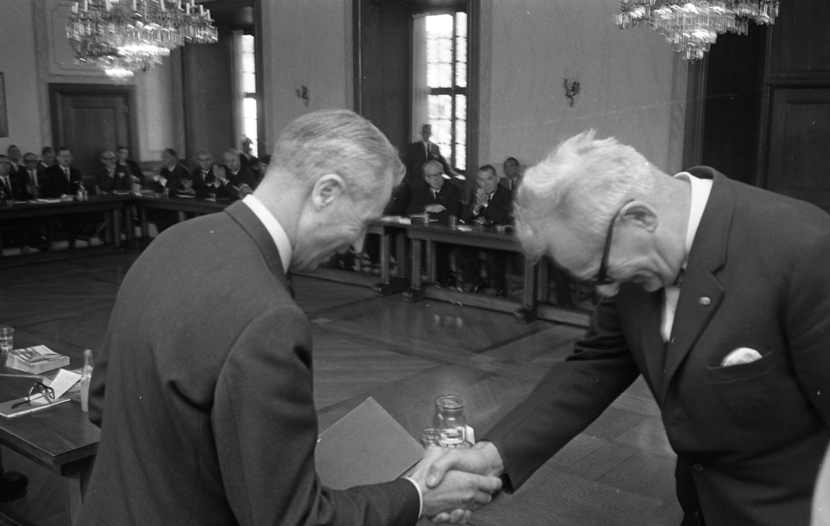 Statsutskottet besöker Arboga. Politikerna har möte i fullmäktigesalen på Rådhuset. Utskottets ordförande, Gösta Bohman tackar stadsfullmäktiges ordförande, Jonas Carlsson.