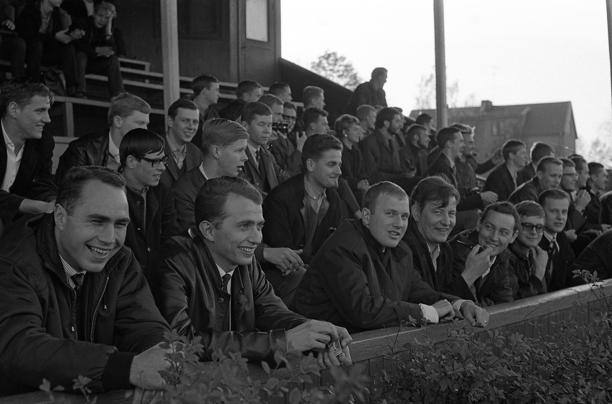 Fotboll på Sturevallen. Tekniska skolans lärare mot elever. Här sitter hejarklacken på läktaren.