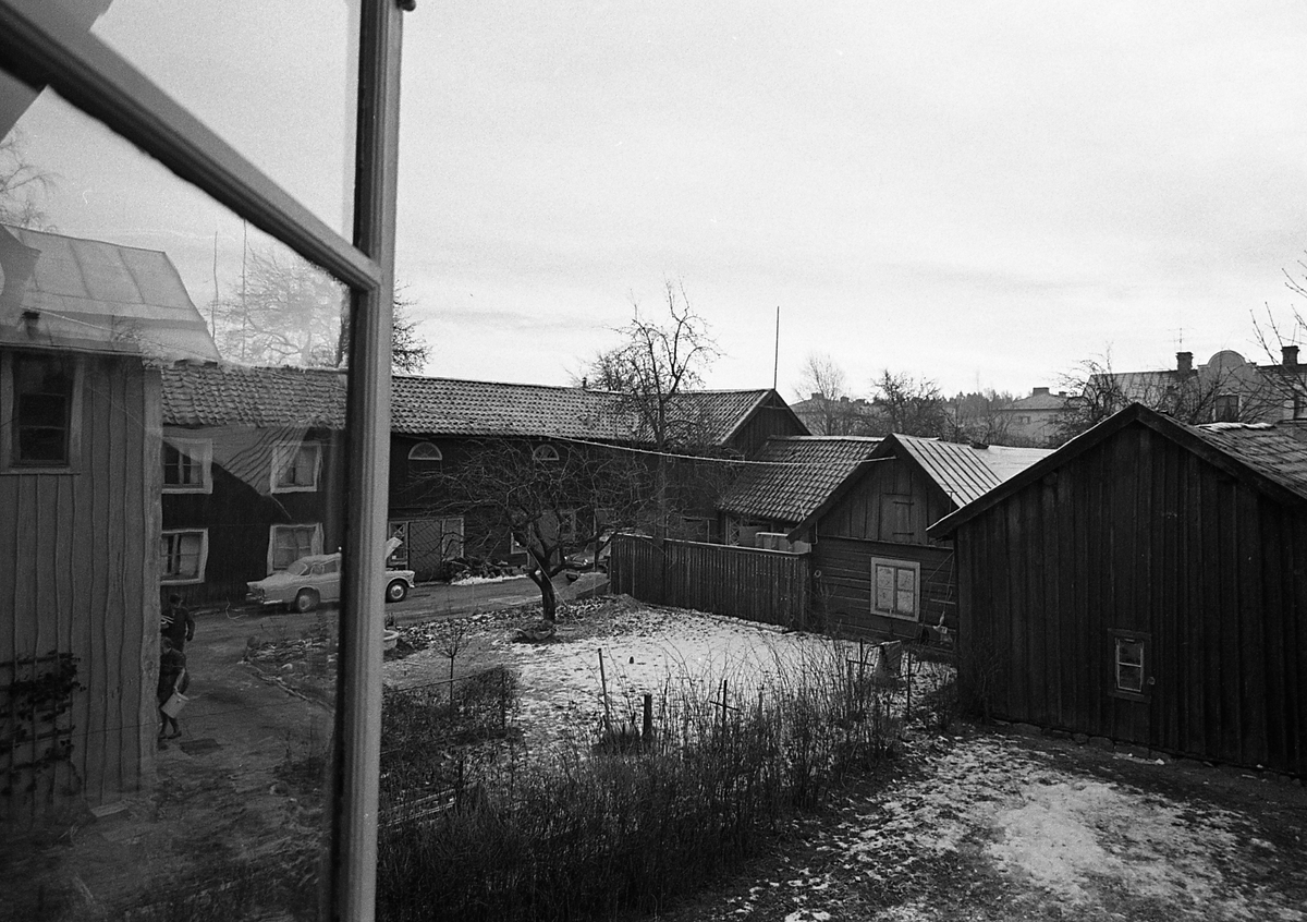 Kvarteret Tullnären, utsikt från en fönster. Det är vinter och snö i trädgården. Ett par människor skymtar. Två bilar är parkerade på gården.