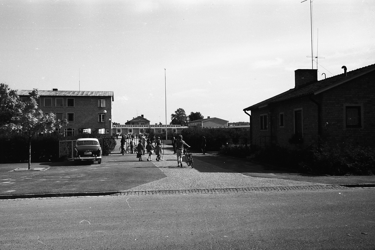 Infarten till Gäddgårdsskolan. Skolbarn på väg till en ny dag. En bil står parkerad.