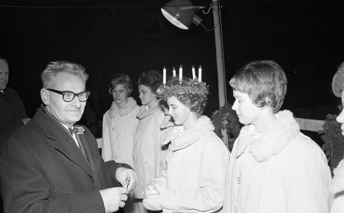 Lucia och tärnor är klädda i varma vinterjackor över sina linnen.