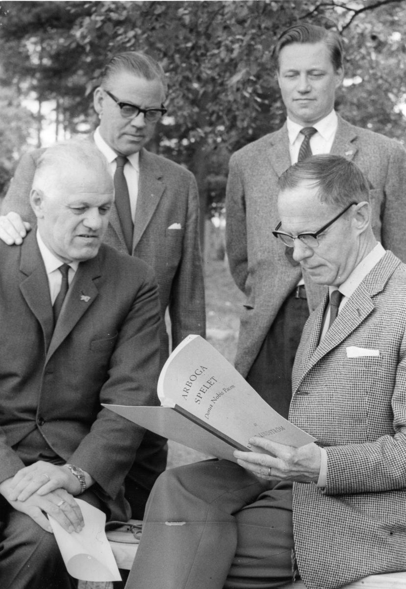 Fyra kostymklädda män är samlade runt manuset till "Giv oss fred".