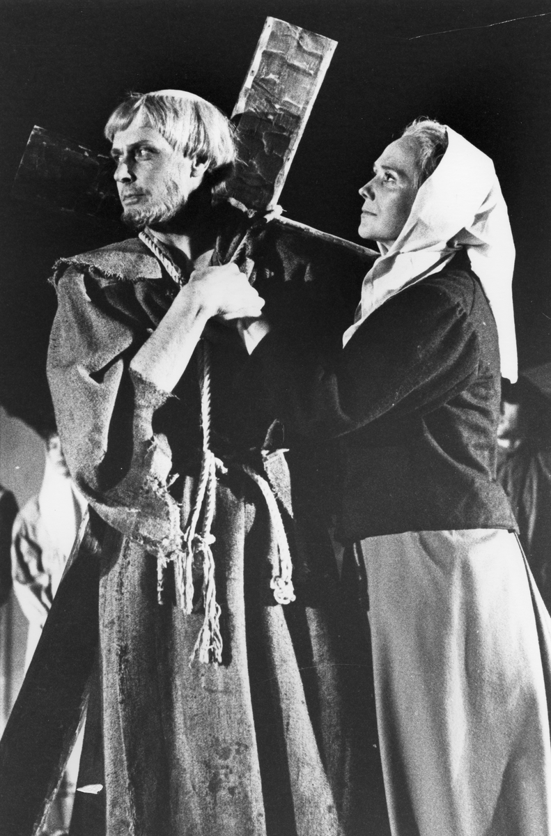 En scen ur den första uppsättningen av skådespelet "Giv oss fred". En munk bär ett stort kors på ryggen, en kvinna står intill honom.